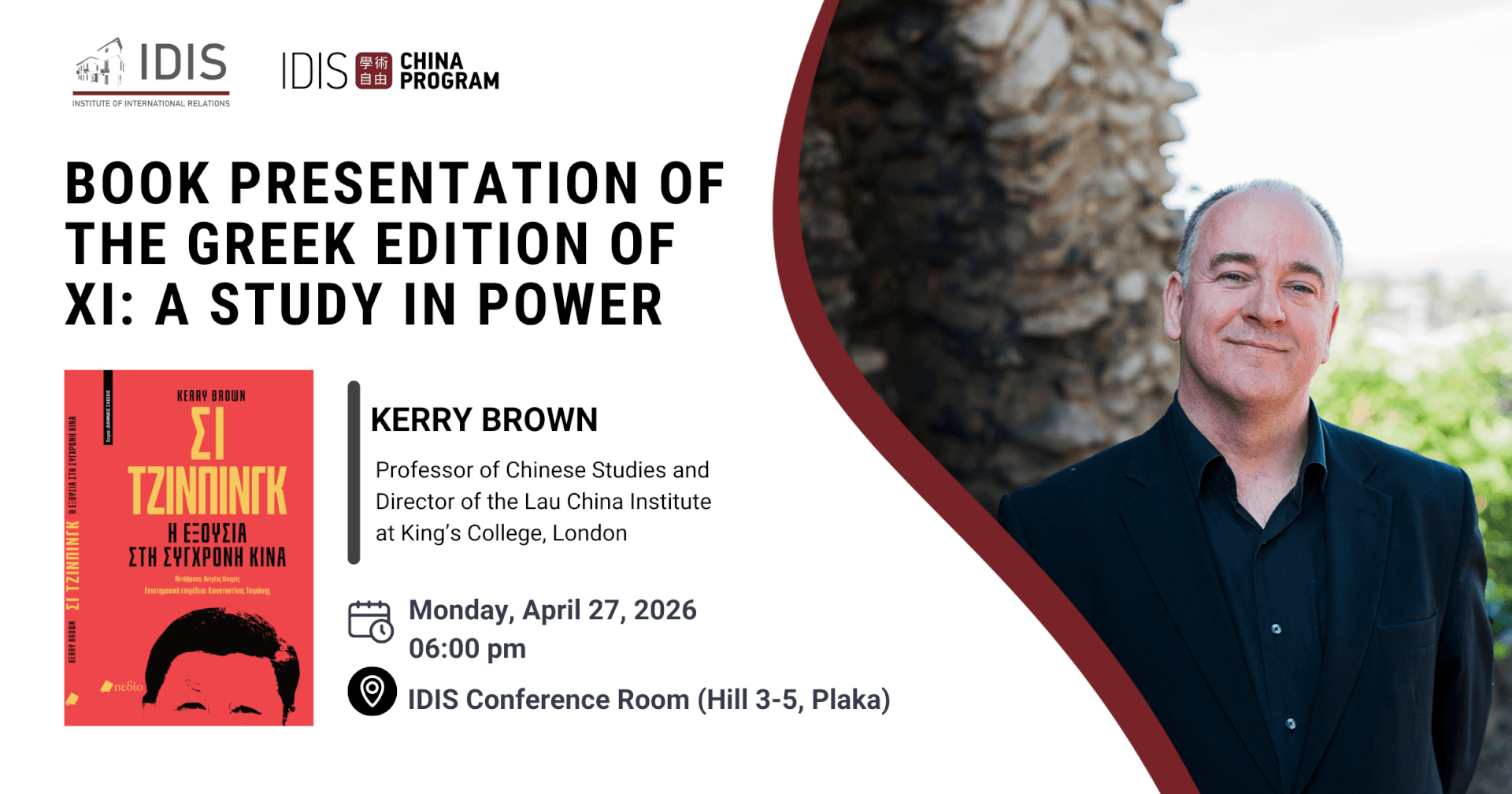 IDIS China Program is pleased to invite you to the book presentation of the Greek edition of Xi: A Study in Power. As part of the event, the author of the book, Kerry Brown, Professor of Chinese Studies and Director of the Lau China Institute at King’s College London, will deliver a lecture.